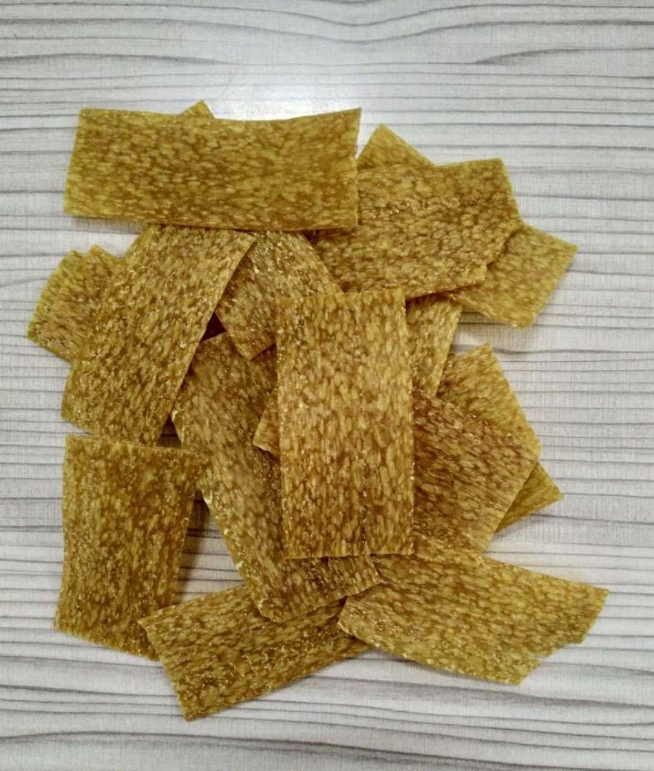 湖北陈总寄来两包苦荞加工膨化食品,用DCCL6-20两米流水线炒货机做测试,效果达到满意! 下图是经过烘干的苦荞片原材料,先把苦荞籽磨成面,再加工成片状